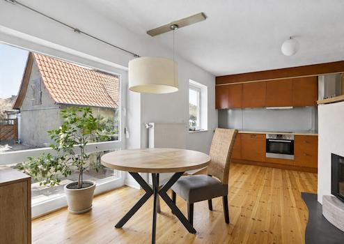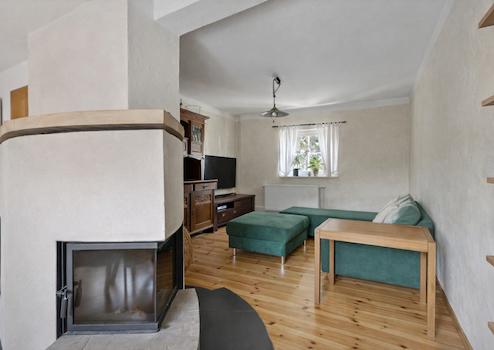 Das Erdgeschoss bildet das Herzstück des Hauses. Hier öffnet sich ein großzügiger Wohn- und Essbereich, der fließend in die Küche übergeht. Der hochwertige, frisch im Jahr 2025 abgeschliffene und geölte Dielenboden unterstreicht den warmen Charakter des Hauses. Ein Kamin sorgt zusätzlich für gemütliche Stunden und macht diesen Bereich zu einem echten Lebensmittelpunkt.
