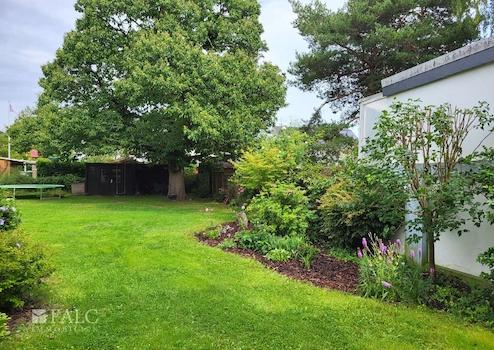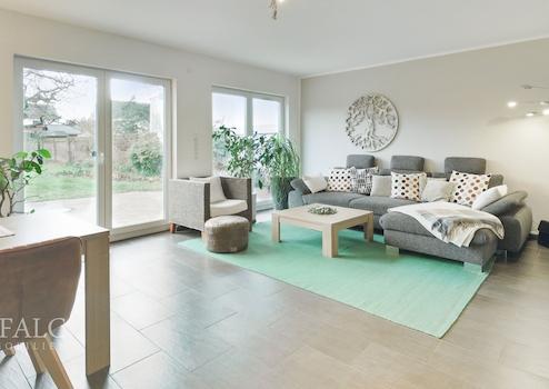 Im Erdgeschoss empfängt ein einladender Eingangsbereich, der in den offen gestalteten Wohn-, Ess- und Küchenbereich übergeht. Dieser bildet den zentralen Lebensmittelpunkt des Hauses und bietet direkten Zugang zur Terrasse mit Markise sowie in den ca. 250 m² großen Garten. Der Außenbereich wird durch ein praktisches Gartenhaus ergänzt. Zudem befinden sich auf dieser Ebene ein Gäste-WC sowie ein Hauswirtschafts- und Technikraum mit moderner Haustechnik.