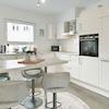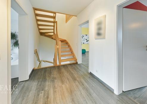 Im Innenbereich unterstreichen geschmackvolle Materialien den modernen Charakter des Hauses. Im Erdgeschoss kommen überwiegend Fliesen zum Einsatz, während eine stilvolle Massivholztreppe die einzelnen Etagen miteinander verbindet. Die Wände sind tapezierfähig vorbereitet und bieten somit individuelle Gestaltungsmöglichkeiten.