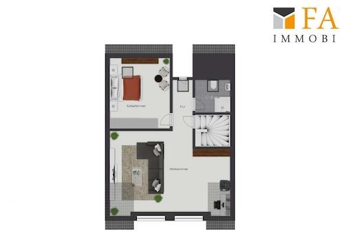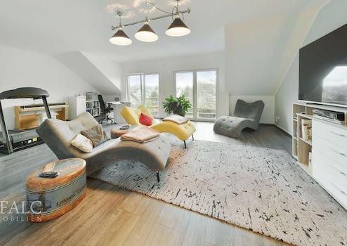 Im Dachgeschoss befindet sich ein weiterer, abgeschlossener Bereich, der sich ideal als Rückzugsort eignet. Die Fläche kann flexibel als Wohn- oder Arbeitsbereich genutzt werden. Ergänzt wird diese Ebene durch ein Schlafzimmer sowie ein Badezimmer mit Dusche.