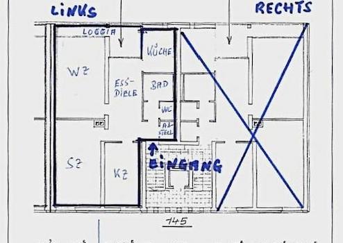 Separates WC / Loggia (7,7 m²) Westseite -herrlicher Blick ins Grüne und den angrenzenden Wald (Naturschutzgebiet) / Parkett in der Diele sowie im Wohnzimmer und im Essbereich. Hausgeld 406 € setzt sich zusammen aus € 207 Betriebskosten + derzeit € 199 Rücklagenzuführung. Grundsteuer € 253,52 p.a.