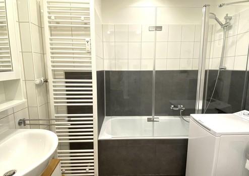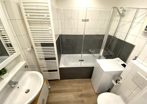 Die separate Küche ist mit einer modernen Einbauküche inklusive Elektrogeräten ausgestattet und bietet alles, was man zum Kochen braucht. Das Badezimmer verfügt über eine Badewanne mit hochwertiger Glas-Duschwand, was einen modernen und gepflegten Eindruck vermittelt.