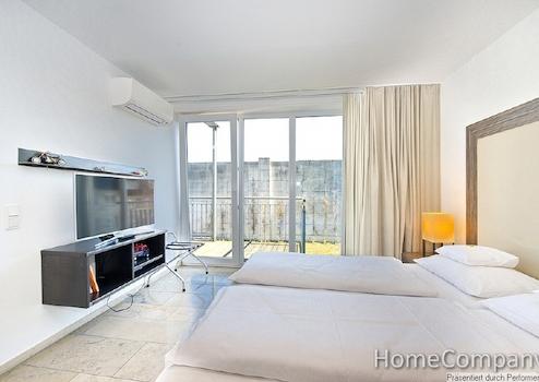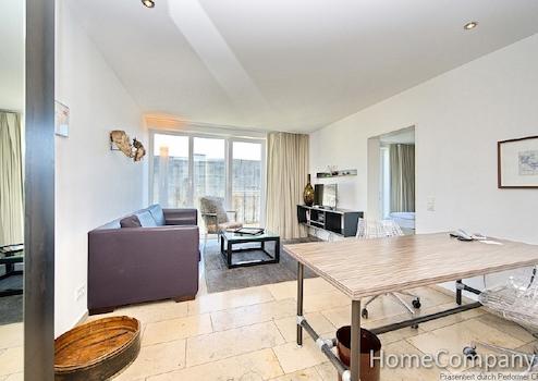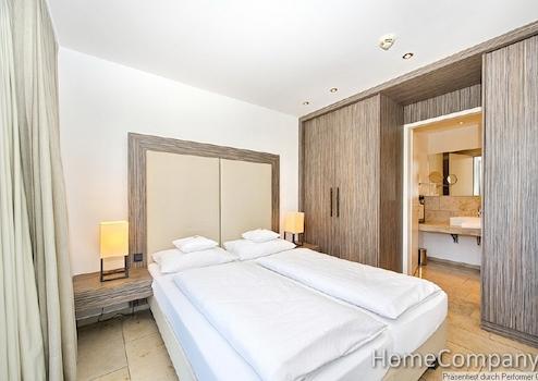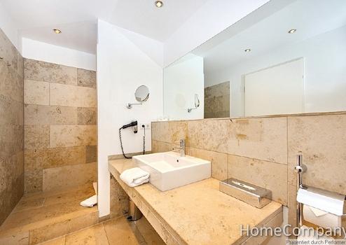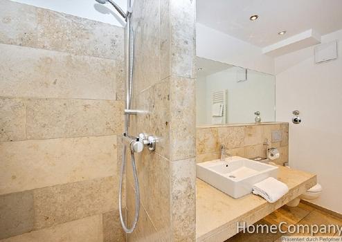 Die Wohnung ist bequem mit dem Aufzug erreichbar. Die Einrichtung ist hochwertig und außergewöhnlich im Design. Der Wohnbereich ist mit einem hochwertigen Sofa, Sessel und Multimediamöbel mit TV ausgestattet. Internetzugang ist vorhanden. Der separate Schlafraum ist mit einem Doppelbett und einem geräumigen Einbauschrank ausgestattet. Der Balkon ist vom Wohnbereich und Schlafbereich begehbar und bietet einen unverbauten Blick. Die offene Einbauküche verfügt über Spülmaschine, Kühlschrank, Mikrowelle mit Grillfunktion und ein Kochfeld. Eine Grundausstattung an Geschirr und Kochutensilien ist vorhanden. Der Tisch lässt sich als Ess- oder auch Arbeitstisch verwenden. Das Bad hat eine geräumige, ebenerdige Duschkabine. Die gesamten Bodenflächen und das Bad sind mit exklusiven Natursteinfliesen versehen. Waschmaschine und ein Trockner stehen zur Mitbenutzung im Keller zur Verfügung.