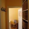 integrierter Wandschrank für Staubsauger/ Bügelbrett usw, offener hoher Regalschrank mit Kisten.