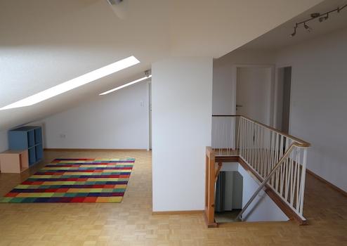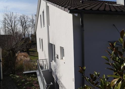 Das nach Süden ausgerichtete Haus befindet sich in sonniger Höhenlage an einer ruhigen Nebenstraße mit Blick auf eine städtische Grünfläche mit altem Baumbestand. In unmittelbarer Nachbarschaft befinden sich der Technologiepark TTR, eine Bushaltestelle und die Natur mit Bauernhöfen und Blick auf die Schwäbische Alb.