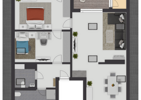 Die Wohnung verfügt über zwei Schlafzimmer. Das Elternschlafzimmer bietet einen direkten Zugang zum Balkon und ermöglicht so einen besonders angenehmen Start in den Tag. Das zweite Schlafzimmer ist flexibel nutzbar und von zwei Seiten begehbar.