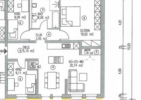 Die Wohnung besteht aus dem hellen großzügigen Wohn/Essbereich von ca. 31 m² mit Zugang auf den Balkon von ca. 8 m ² (Wohnfläche 3,94 m²). In dem Wohnraum ist die Küche integriert. Hier wird eine attraktive Einbauküche installiert. Über den Wohnraum gelangen Sie in den separaten Schlaftrakt. Dieser besteht aus dem großzügigen Schlafzimmer von ca. 19 m², dem attraktiven Bad mit Fenster von ca. 9 m² (ausgestattet mit Wanne und Dusche) sowie einem Kinderzimmer/Büro von ca. 9 m². Diele, Garderobe sowie ein weiteres Büro/Kinderzimmer von ca. 10 m² vervollständigen das Angebot. Die gesamte Wohnfläche beträgt ca. 91 m².