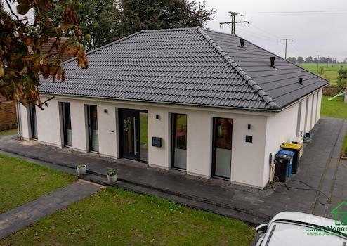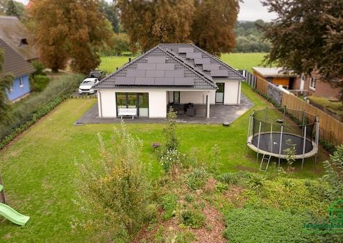 Das Haus ist massiv gebaut und verfügt über ein Walmdach mit Betondachsteinen, dreifach verglaste Kunststofffenster sowie eine Fußbodenheizung im gesamten Erdgeschoss. Für zeitgemäßen Wohnkomfort sorgen eine Lüftungsanlage, eine Luft-Wärmepumpe von Deikin (Baujahr 2020) sowie eine Photovoltaikanlage mit 11 kW in Verbindung mit einem Batteriespeicher (13,5 kW). Eine Wallbox mit 11 kW ist ebenfalls vorhanden und macht das Objekt zukunftssicher für Elektromobilität.
