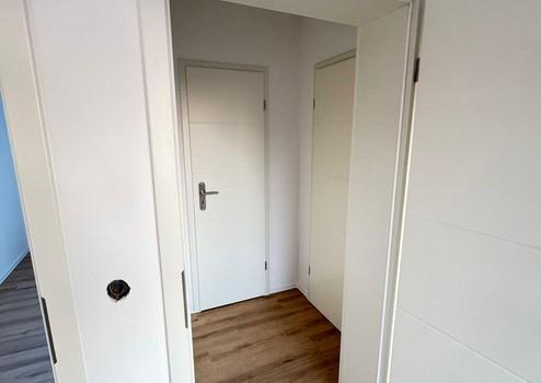 Der Wohnraum präsentiert sich hell und offen, mit einer angenehmen Raumwirkung durch große Fensterflächen und einem klar strukturierten Grundriss. Die Kombination aus modernen Oberflächen, warmem Boden in Holzoptik und neutraler Farbgestaltung schafft eine wohnliche Atmosphäre, die sich leicht individuell einrichten lässt.