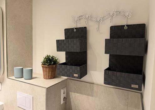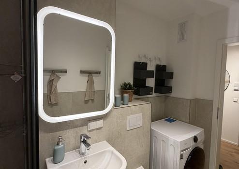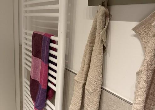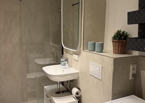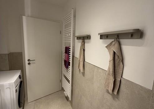 - Großzügiges modernes Badezimmer mit Dusche, Handtuchheizkörper und neuer Waschmaschine und Ablagemöglichkeiten, Handtuchhaltern