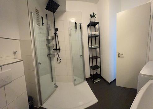 - Hochwertige, begehbare, ebenerdige Regendusche mit Glasfalttüren & Waschmaschine im Bad integriert