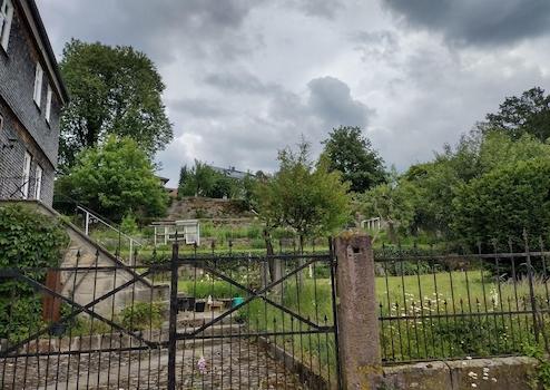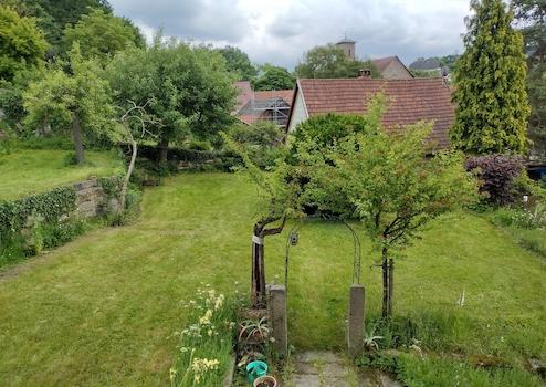 Der weitläufige Garten von über 1.000 m² ist durch Sandsteinmauern terrassiert und bietet vielfältige Gestaltungsmöglichkeiten. Er verfügt über einen Kirschbaum, mehrere Zwetschgen- und Apfelbäume, einen Birnbaum und einen Walnussbaum. Zudem ist ein Gemüsegarten angelegt.
