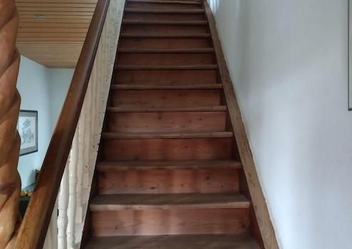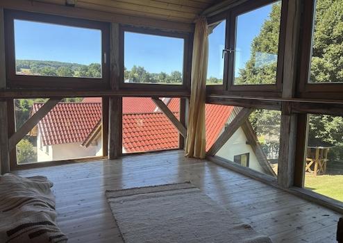 Im Erdgeschoss betreten Sie das Haus zunächst über einen Vorraum, der ideal zur Aufbewahrung von Jacken und Schuhen geeignet ist. Anschließend erwarten Sie ein großes Schlafzimmer, ein Badezimmer, ein geräumiges Wohnzimmer mit einem Kachelofen sowie eine Küche. Eine Holztreppe führt ins Obergeschoss, wo sich ein Wintergarten, ein großer Balkon, vier Zimmer, ein weiteres Badezimmer mit Dusche und eine zusätzliche Toilette befinden.