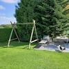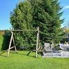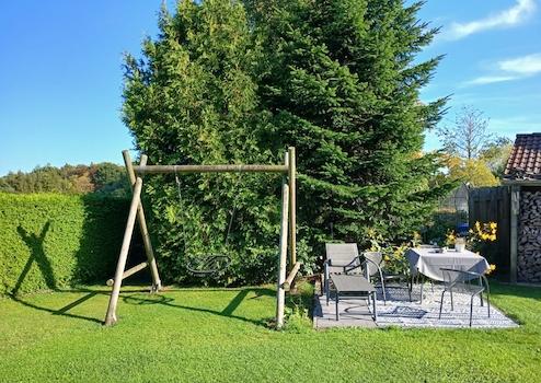 Die 2. Terrasse liegt in einer baumbestandenen Ecke, dort finden Sie eine Nestschaukel und einen hochwertigen Strandkorb.