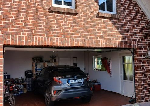 Es gibt eine Doppelgarage mit Sektionaltor.