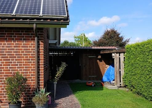 Darüberhinaus gibt es eine Art Carport, dort können Fahrräder, Motorrad und die Mülltonnen untergebracht werden, ein Tor führt von dort in den Garten.