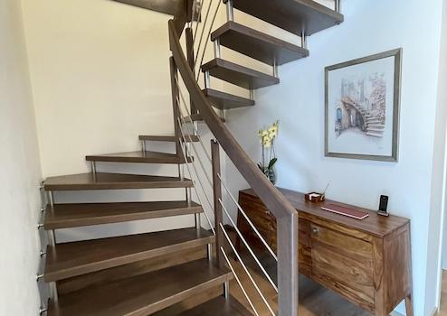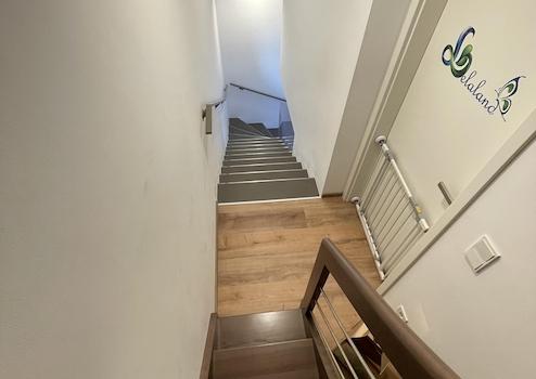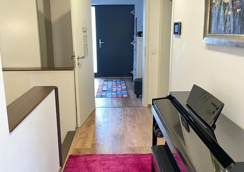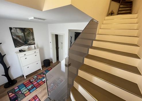 Die Ausstattung verbindet hochwertige Materialien mit modernen Details. In den Wohnbereichen wurden langlebige Bodenbeläge, elegante Fliesen sowie zeitlose Bad- und Sanitärelemente gewählt. Auch architektonische Elemente wie die offene Treppengestaltung ergänzen das stimmige Erscheinungsbild der Immobilie.