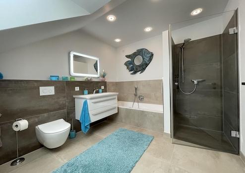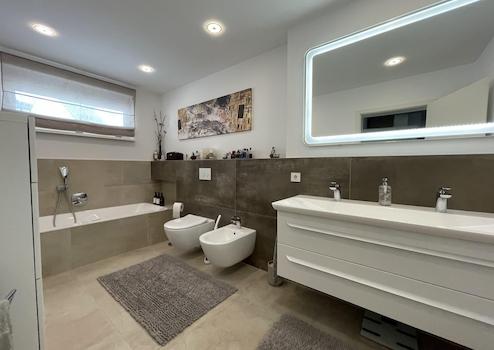 • Großes Badezimmer mit Badewanne, Doppelwaschbecken, WC und Bidet
