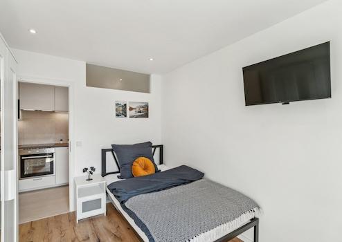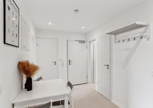 In addition to the private living room/bedroom, the apartment has a spacious kitchen/dining area. The fully equipped communal kitchen has a fridge with freezer compartment, a dishwasher, a stove, a microwave, an extractor hood with plasma filter and an oven as well as several built-in cupboards.