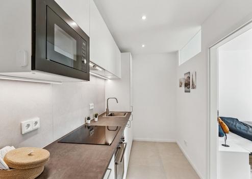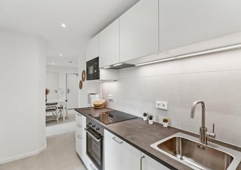 Neben dem privaten Wohn-/Schlafzimmern verfügt die Wohnung über einen großzügigen Küchen-/Essbereich. Die voll ausgestattete Gemeinschaftsküche verfügt über einen Kühlschrank mit Gefrierfach, einen Geschirrspüler, einen Herd, eine Mikrowelle, eine Dunstabzugshaube mit Plasmafilter und einen Backofen sowie mehrere Einbauschränke.