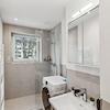 Das Duschbad besteht aus einem Waschbecken, einer Walk-In-Rainshower-Dusche, einem Handtuchheizkörper und einem Waschtrockner.