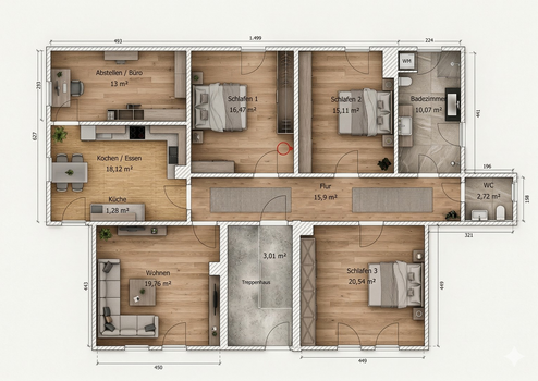 1. Obergeschoss: ca. 130 m², großzügige 5-Zimmer-Wohnung.