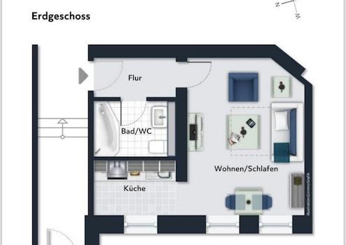 Angefangen von einem modernisierten Bad mit Wanne, über den separaten Flur, einem Küchenseparé mit nagelneuer IKEA Küche + Kühl-Gefrierschrank, bis zum großen Wohn-/ Schlafzimmer.