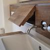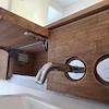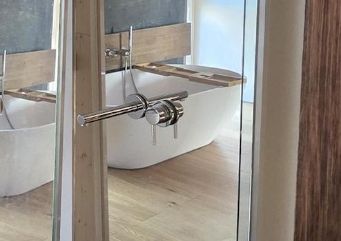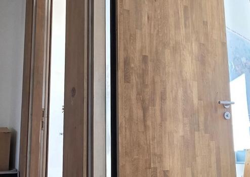 Maßgefertigte Tischlerarbeit: Deckenhohe Türen (2,65 m) aus 4 cm massivem Eichenholz und handgefertigte Badmöbel unterstreichen den Unikat-Charakter.