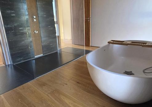 Die Wellness-Oase: Das Master-Bad besticht durch eine freistehende 300 kg Mineralgusswanne auf versiegeltem Echtholzparkett sowie eine zweiseitig begehbare Glas-Regendusche. Beheizte Design-Spiegel mit integrierten Armaturen sind nur eines der technischen Highlights.