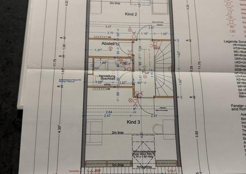 -Obergeschoss: zwei Zimmer, ein Vollbad mit Dusche, WC und Waschbecken.