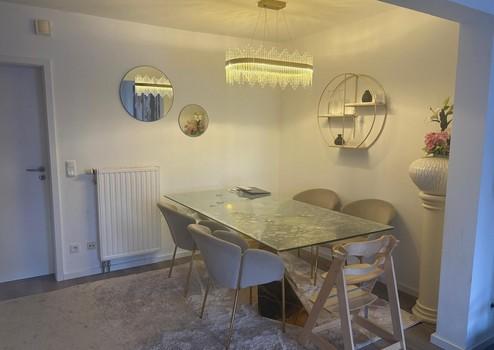 Erdgeschoss: Großzügiges Wohnzimmer mit Essecke und Zugang zur Terrasse/Garten, separate Küche, Gäste-WC.