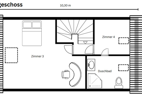 Dachgeschoss: Ein großes Schlafzimmer, ein weiteres Gäste oder Kinderzimmer sowie ein separates Duschbad.