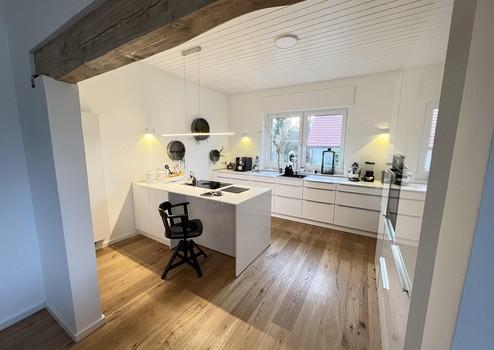 Die hochwertige, weiße Schüller-Küche mit Markengeräten und Bora-Kochfeld kann übernommen werden.