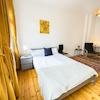 Diese 65 m² große Wohnung verfügt über zwei Zimmer, überzeugt durch seinen guten Schnitt und ist auch für WGs geeignet. Das eine Zimmer („South Room“) ist ca. 21 m² groß; das andere Zimmer („North Room“, mit einem Balkon) hat eine Größe von ca. 25 m². Die voll ausgestattete Küche verfügt u. a. über Backofen, Herd, Mikrowelle und Kühlschrank, Kaffeemaschine, Geschirr, Töpfe, Teller, Gläser, etc. Das Bad mit Tageslicht ist mit einer Waschmaschine ausgestattet. Wir stellen Ihnen auch Bettwäsche und Handtücher zur Verfügung. Jedes Zimmer verfügt über einen Schreibtisch und einen Schreibtischstuhl. Das Internet ist von sehr guter Qualität. Die Wohnung befindet sich im 4. Stock und ist sehr hell und ruhig.