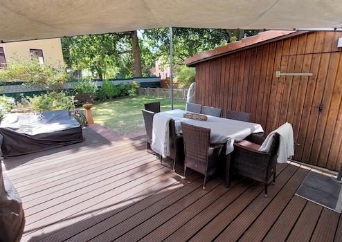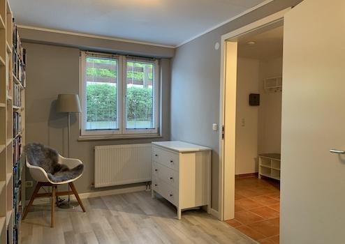 • Aus dem Wohnzimmer haben Sie Zugang zur Holzterrasse und zum pflegeleichten Garten. Hier befindet sich auch ein Abstellraum für Gartengeräte.