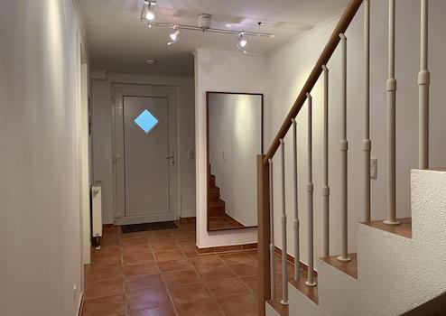 • Durch die überdachte Haustür betreten Sie den gefliesten Eingangsbereich mit Windfang, der ausreichend Platz für eine Garderobe bietet.