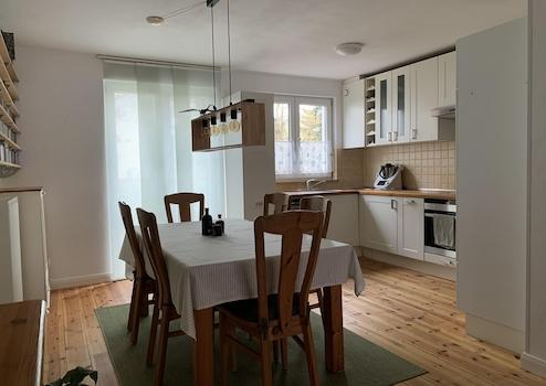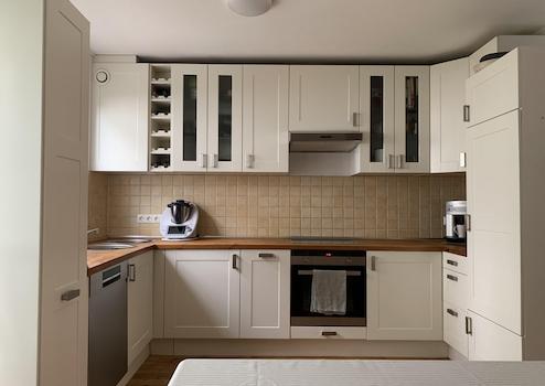 • Die Einbauküche fügt sich zeitlos ins freundliche Erscheinungsbild ein. Die Elektrogeräte wurden erst vor wenigen Jahren erneuert.