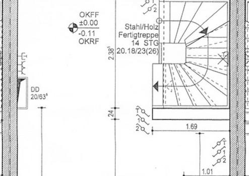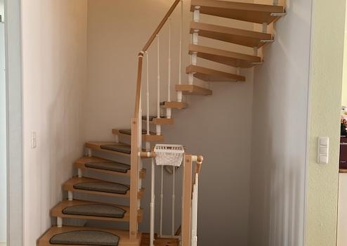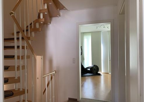 • Über die offene, gewendelte Holztreppe, die sich bis zum Dachgeschoss erstreckt, gelangen Sie zunächst zum ersten Obergeschoss.