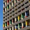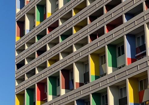 Die klar gegliederte Fassade mit farblich akzentuierten Loggien prägt das Erscheinungsbild des Bauwerks.