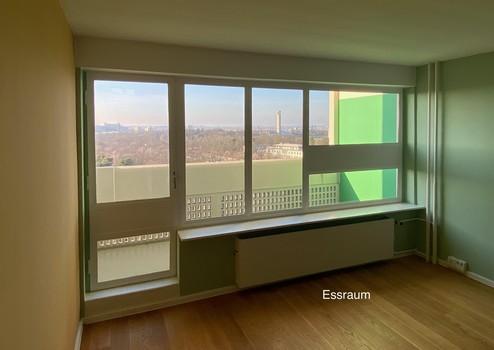 Die Wohnung ist außer im Bad und in der Küche mit schwimmend verlegtem Parkett ausgestattet. Die Wände sind gespachtelt und in von Corbusier empfohlenen Farben gestaltet.