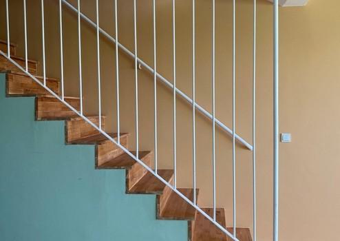 Eine interne Treppe führt zur oberen Etage mit offenem Wohnbereich, Schlafraum und dazwischenliegendem barrierefreien Duschbad.