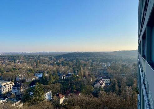 Aus der Höhe der Wohnung öffnen sich über die Balkone Panoramablicke nach Westen über den Grunewald und nach Osten über Berlin.