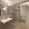 Das Bad ist mit großflächigen sandfarbenen Fliesen, stufenloser Dusche und großem Spiegel sachlich zurückhaltend modernisiert.