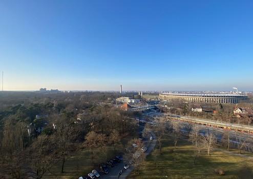 Vom westlich ausgerichteten Balkon öffnet sich ein Panoramablick vom Olympiastadion bis über den Grunewald.