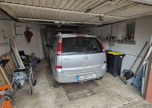 Vom Garten mit Schuppen, gehen Sie durch die Eingangstür in die Garage, mit Schrauber Grube.
