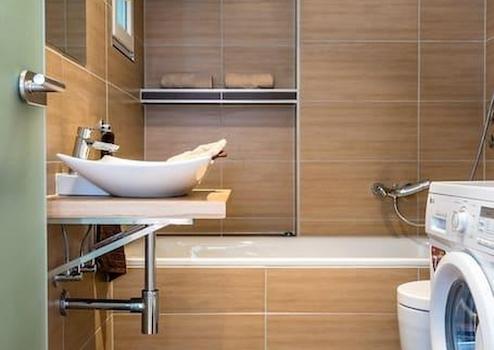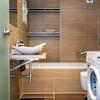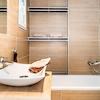 Frisch modernisiert: Das Badezimmer wurde seit dem Erwerb komplett kernsaniert und besticht durch ein zeitloses, modernes Design mit großformatigen Fliesen und hochwertigen Armaturen.