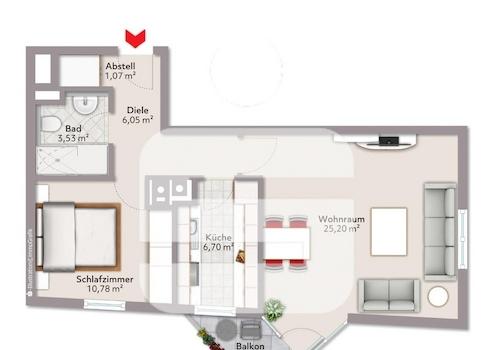 Die vorhandene Einbauküche verfügt über Herd, Backofen, Mikrowelle und Spülmaschine – alles für den Alltag Nötige ist vorhanden. Über die großzügige Diele (ca. 6 m²) erreichen Sie alle Räume bequem. Das Badezimmer wurde im Zuge der Sanierung vollständig modernisiert und verfügt über Badewanne, Waschbecken und WC in zeitgemäßer Gestaltung. Ein Abstellraum innerhalb der Wohnung bietet zusätzlichen Stauraum. Der Balkon erweitert den Wohnbereich nach draußen.