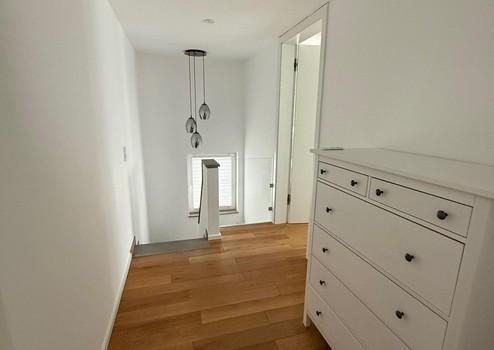 Über eine Treppe erreichen Sie die obere Ebene der Maisonettewohnung. Hier erwartet Sie ein großzügiges Schlafzimmer mit integriertem Arbeitsbereich, der sich ideal für Homeoffice oder eine ruhige Leseecke eignet. Direkt angrenzend befindet sich eine separate Ankleide, die zusätzlichen Komfort und Stauraum bietet.