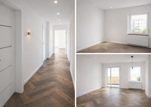 In den Wohnräumen und im Flur wurde dunkles, strapazierfähiges Design-Vinyl verlegt, das der Wohnung eine moderne und hochwertige Ausstrahlung verleiht. Ein Balkon zum Innenhof rundet das Wohnangebot ab.