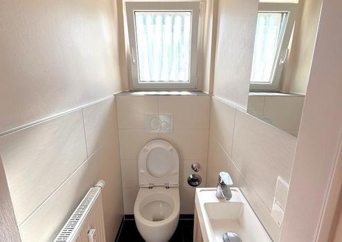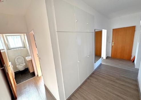 Die Wohnung ist mit einem modernen Tageslichtbad mit fast bodenebener Dusche ausgestattet, hier wird auch die Waschmaschine aufgestellt. Das nebenan liegende separate WC wurde ebenfalls 2021 mit weißen Wandfliesen und anthrazitfarben Bodenfliesen gestaltet. Die Wohn- und Schlafräume, so wie die separate Küche, sind mit Vinyl-Böden verlegt. Vom üppigen Wohnzimmer erreichen Sie die große Terrasse - kein Problem für Grill, eine große Lounge und viele Pflanzentöpfe. Das Schlafzimmer ist ebenfalls überdimensioniert, so dass Sie hier Ihre eigene Schrankwelt und einen Schreibtisch/Arbeitsplatz integrieren können. Im Flur sind bereits Schränke für Garderobe, Bügelbrett und Staubsauger eingebaut.